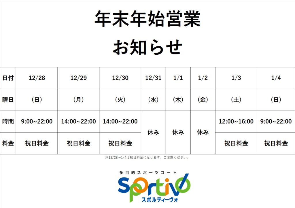 年末年始(2025/2026)の営業時間とコートレンタル料金についてご案内です。