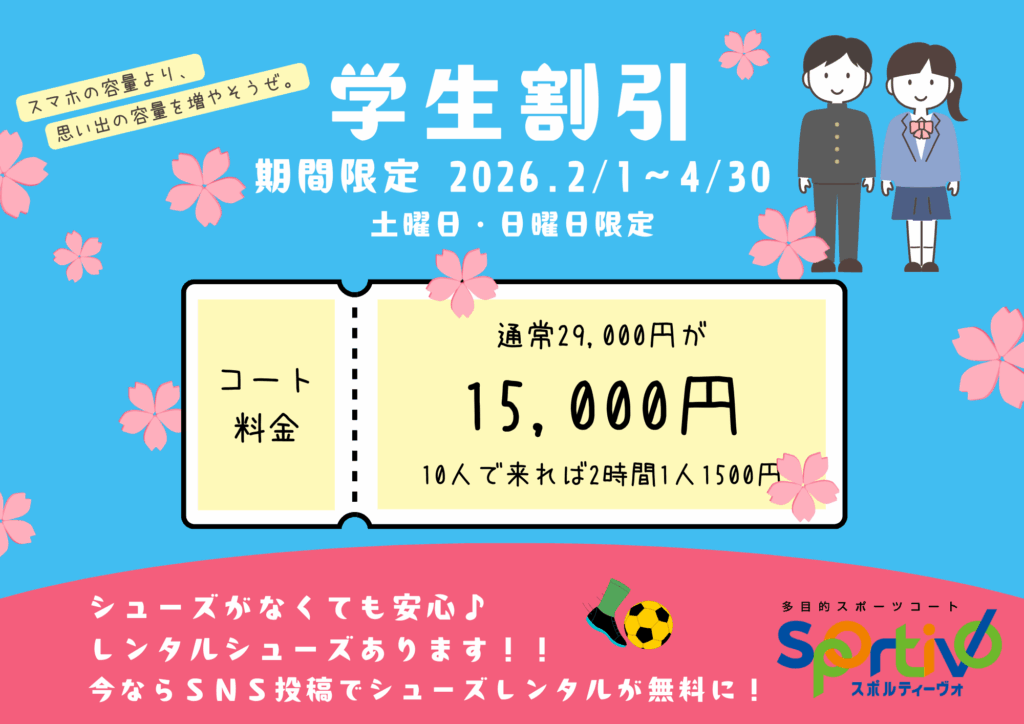 ご利用当日に学生証・年齢確認ができるものを全員が提示することでコート利用料が激安になります。